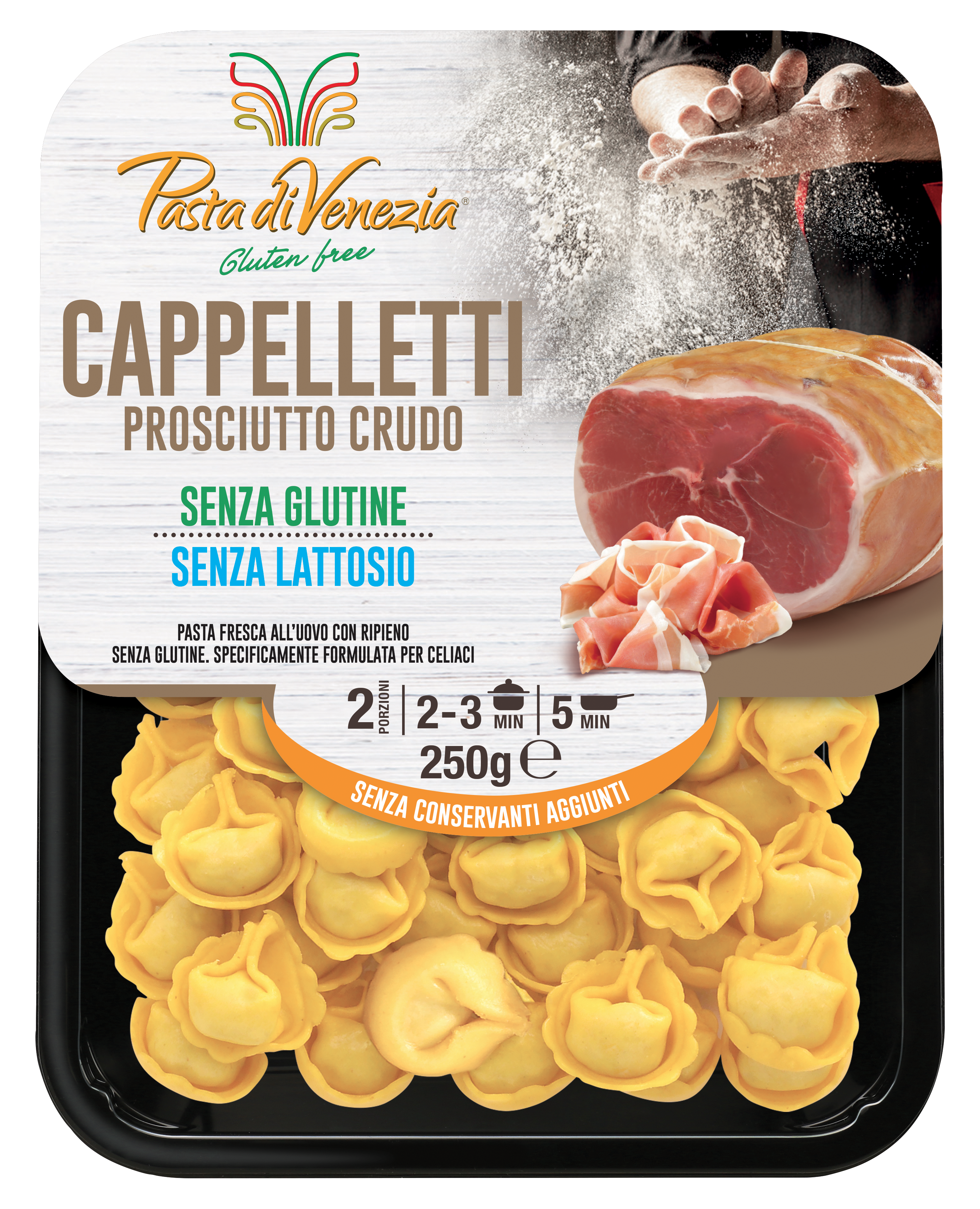Ripieno 27%: prosciutto crudo 14,3%* (coscia di suino, sale), mortadella (carne di suino, sale, conservante: E250, antiossidante: E301), semilavorato senza glutine (farina di mais, olio di semi di girasole, zucchero caramellizzato), formaggio Grana Padano DOP (latte, sale, caglio, conservante: lisozima da uovo), rosmarino, noce moscata, salvia, fibre vegetali.