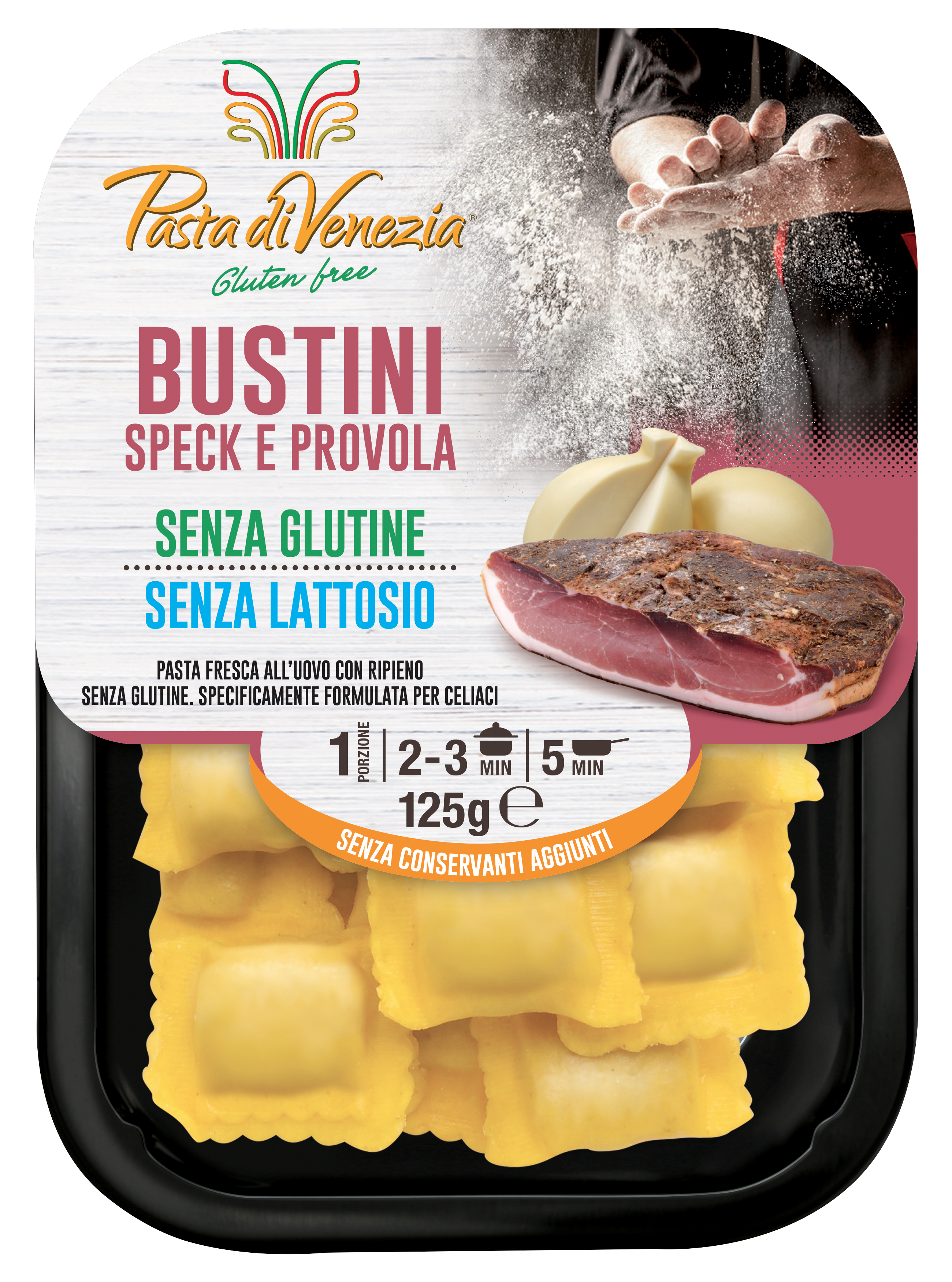 Preparato per pasta senza glutine 56%: amido di mais, acqua, tuorlo d’uovo 20%, fecola di patate, farina di riso, addensante: gomma di guar, olio extravergine di oliva, sale. Ripieno 44%: speck 66%, formaggio Provola affumicata senza lattosio 16% (latte senza lattosio, sale, enzima coagulante, fermenti lattici), formaggio Grana Padano DOP (latte, sale, caglio, conservante: lisozima da uovo), semilavorato senza glutine (farina di mais, olio di semi di girasole, zucchero caramellizzato), sale, pepe nero, fibra di bambù