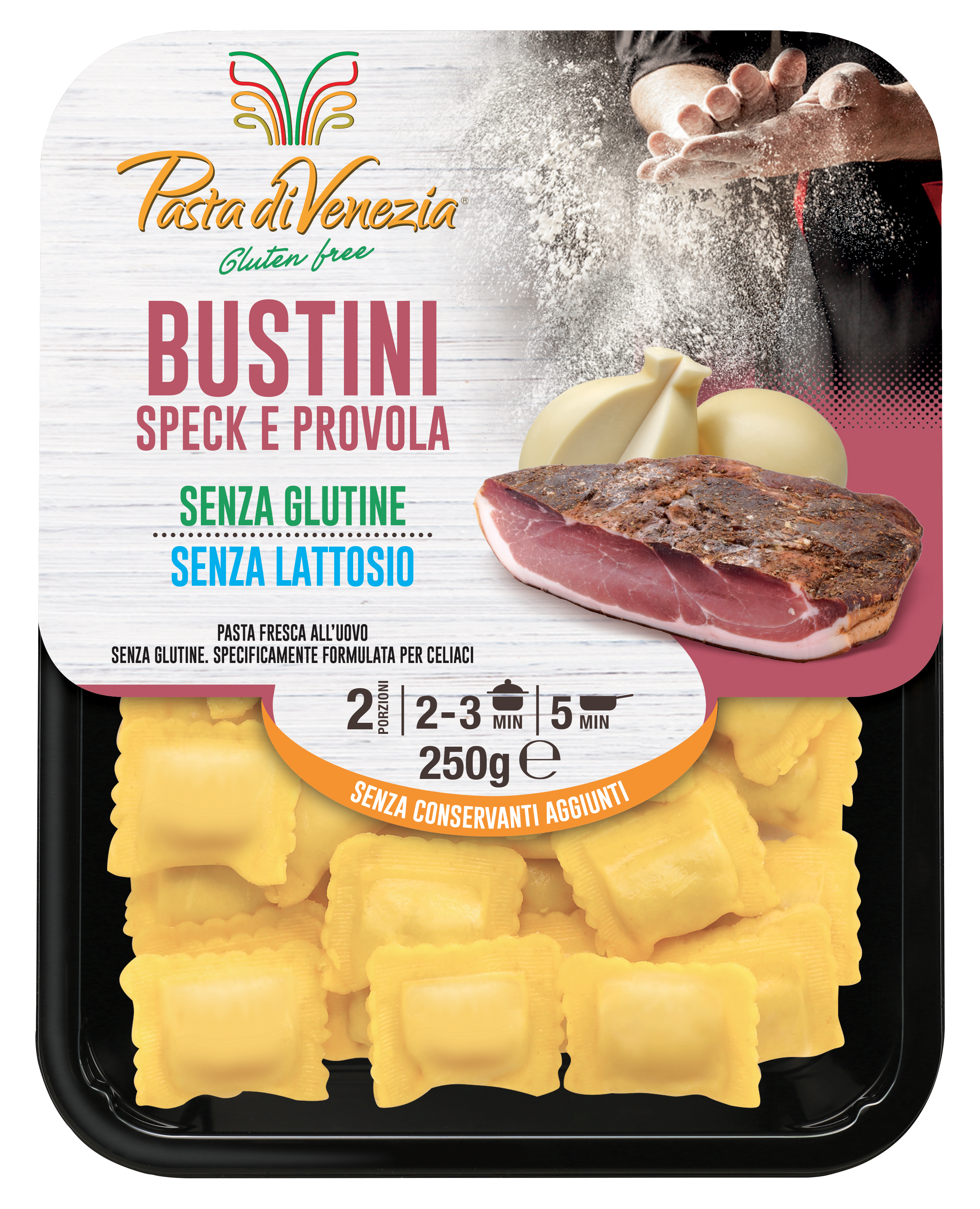 Preparato per pasta senza glutine 56%: amido di mais, acqua, tuorlo d’uovo 20%, fecola di patate, farina di riso, addensante: gomma di guar, olio extravergine di oliva, sale. Ripieno 44%: speck 66%, formaggio Provola affumicata senza lattosio 16% (latte senza lattosio, sale, enzima coagulante, fermenti lattici), formaggio Grana Padano DOP (latte, sale, caglio, conservante: lisozima da uovo), semilavorato senza glutine (farina di mais, olio di semi di girasole, zucchero caramellizzato), sale, pepe nero, fibra di bambù.