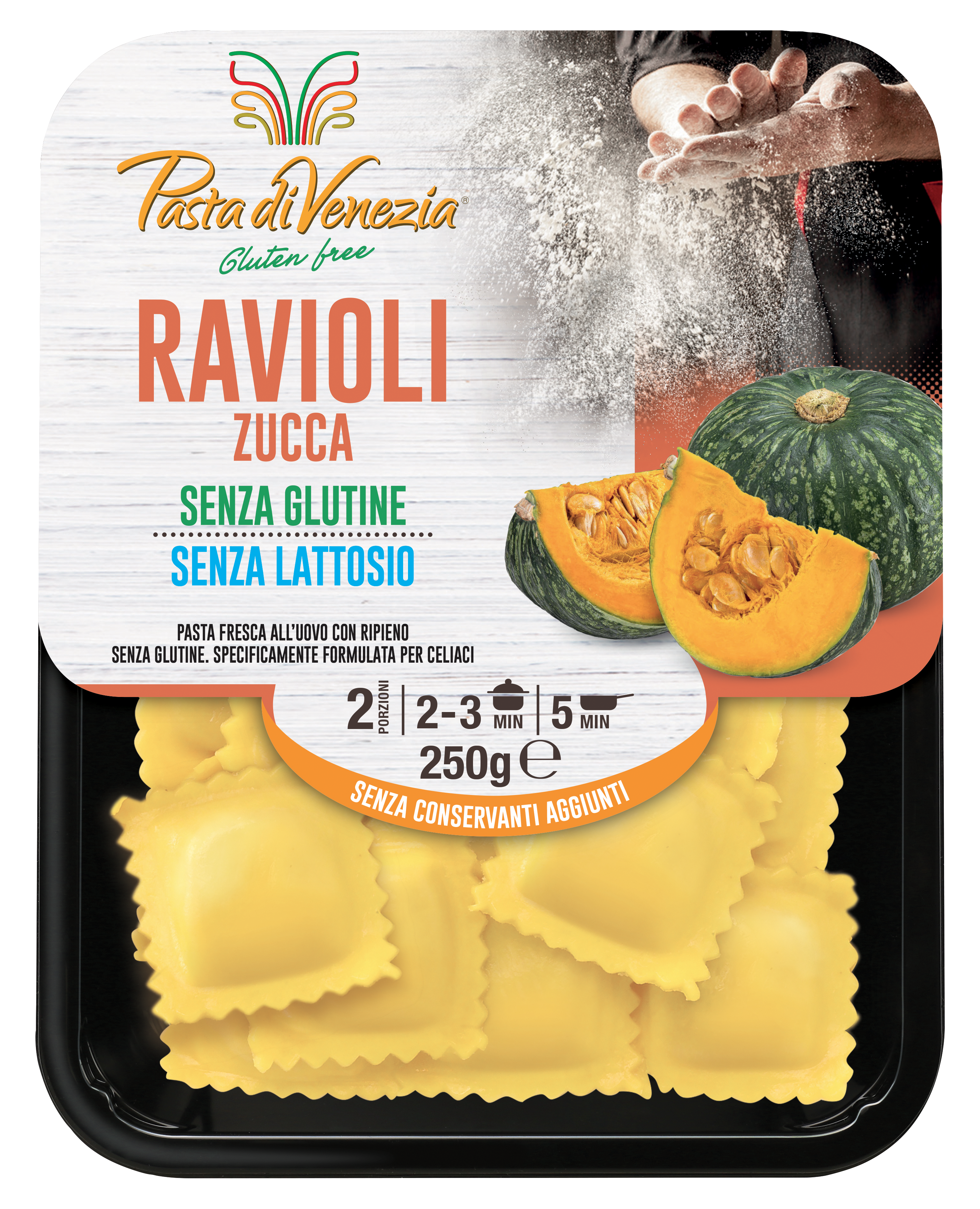 Ripieno 54%: purea di zucca 50,2%*, formaggio Grana Padano DOP (latte, sale, caglio, conservante: lisozima da uovo), fibre vegetali.