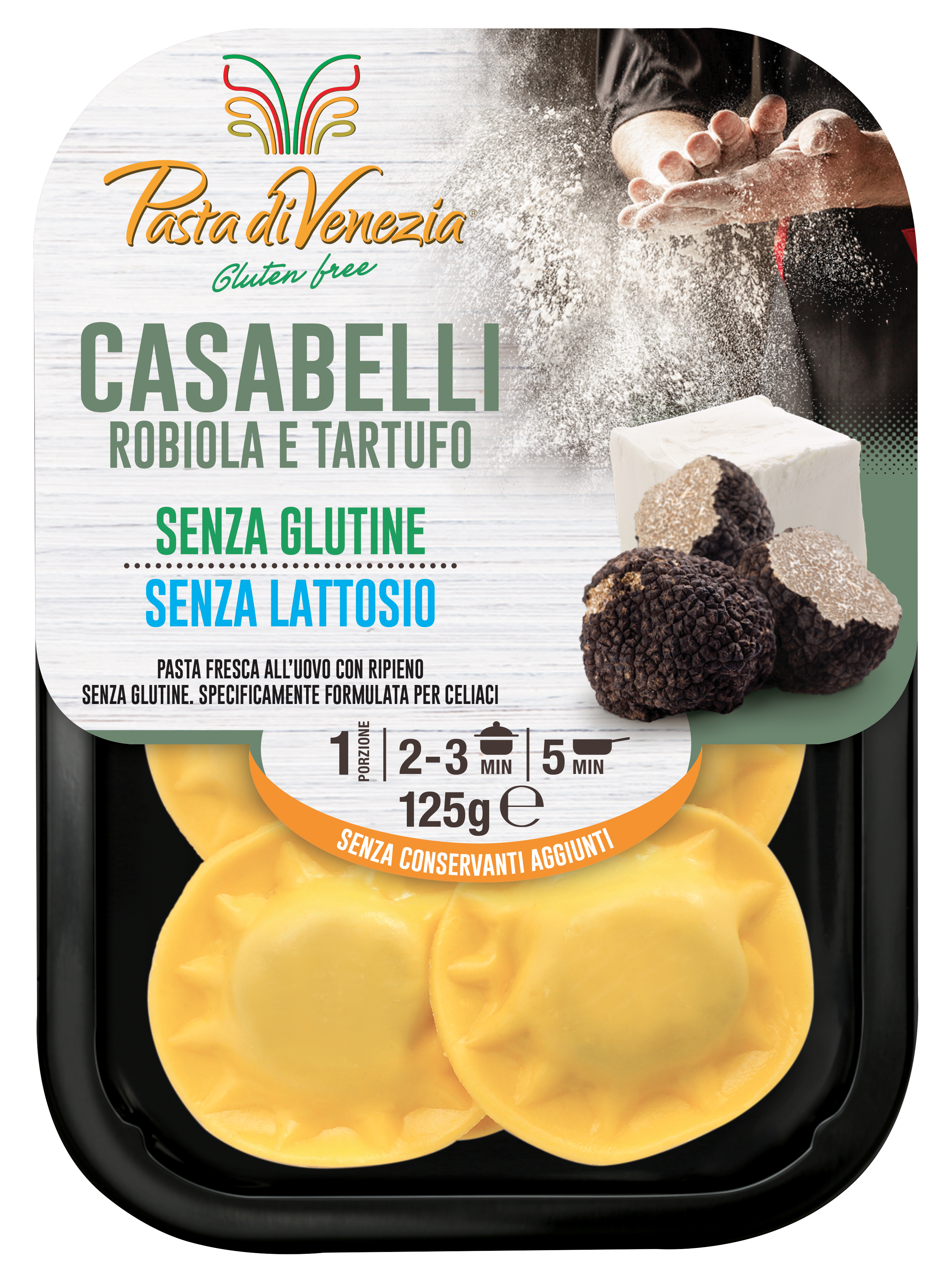 Ripieno 44%: ricotta senza lattosio (siero di latte senza lattosio, latte senza lattosio, crema di latte senza lattosio, sale, correttore di acidità: E270), formaggio Robiola senza lattosio 8%* (latte senza lattosio, crema di latte senza lattosio, fermenti lattici, sale), formaggio Grana Padano DOP (latte, sale, caglio, conservante: lisozima da uovo), semilavorato senza glutine (farina di mais, olio di semi di girasole, zucchero caramellizzato), tartufo 1,7%*, sale, pepe nero, fibre vegetali.