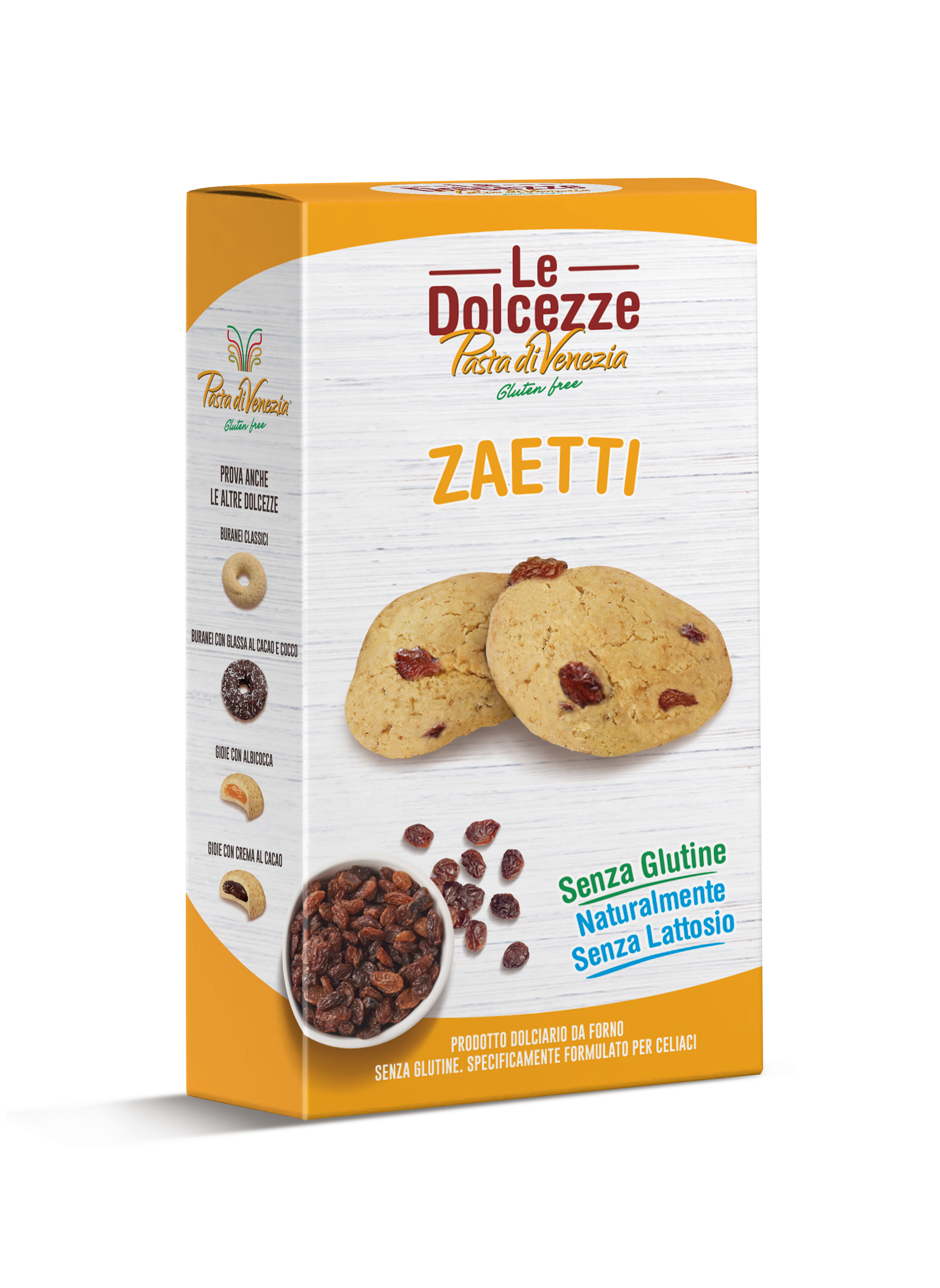 Preparato alimentare senza glutine (fecola di patate, farina di riso, farina di miglio bruno, maltitolo, addensanti: gomma di guar, idrossipropilmetilcellulosa; fibra di psyllium), zucchero, farina di mais 15%, margarina (grasso di palma, olio di girasole, acqua, emulsionanti: mono e digliceridi degli acidi grassi da palma, lecitina di girasole; conservante: sorbato di potassio, correttore di acidità: acido citrico, aromi, colorante: betacarotene), uva sultanina 10% (uva 99,5%, olio di girasole/olio di cotone 0,5%), uova pastorizzate, albume d’uovo pastorizzato, sale, vanillina, aroma.