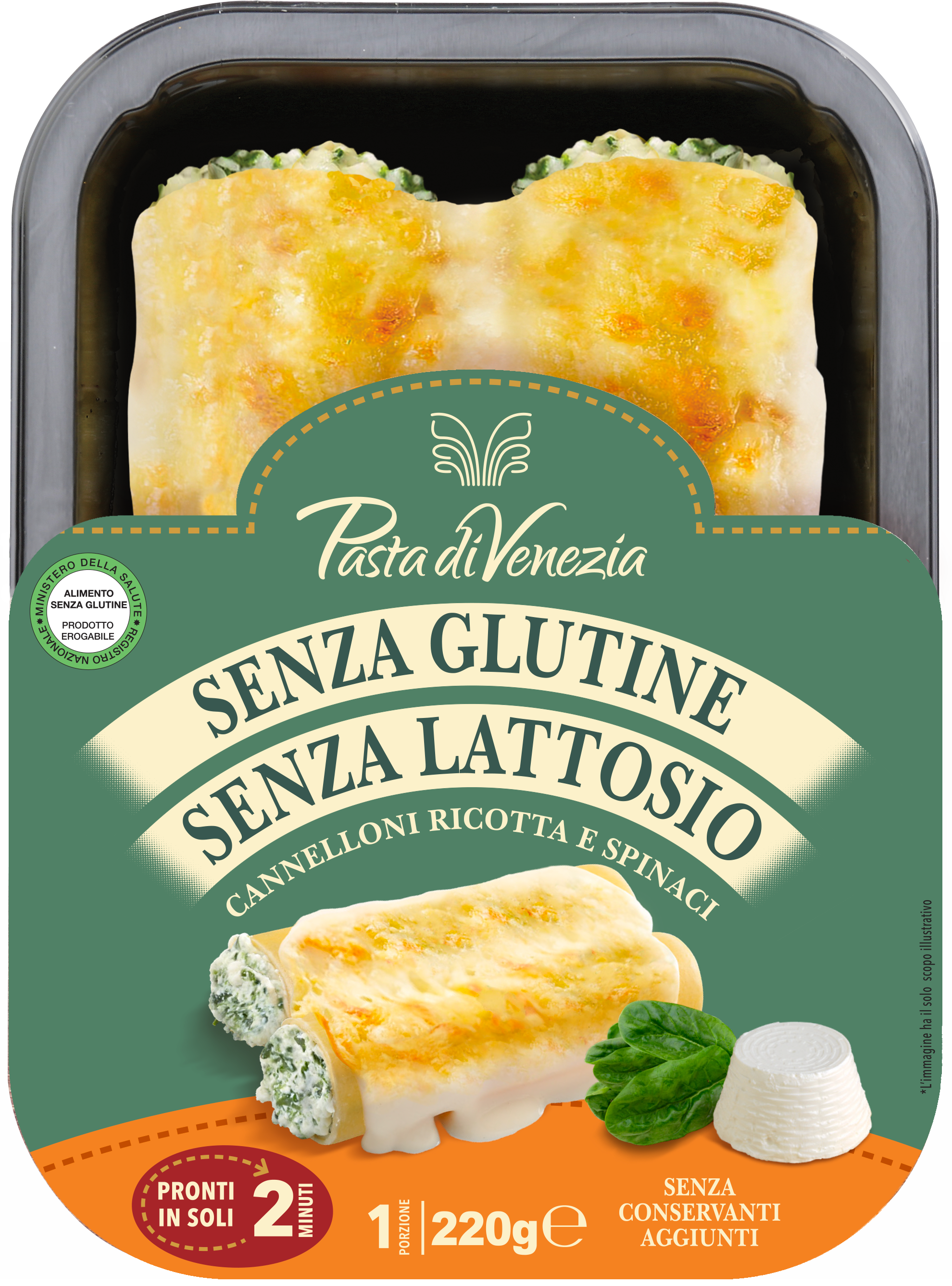 Ripieno di ricotta e spinaci 42,4% (ricotta senza lattosio 20,3%* (siero di latte senza lattosio, latte senza lattosio, crema di latte senza lattosio, sale, correttore di acidità: E270), spinaci 17%*, formaggio Grana Padano DOP (latte, sale, caglio, conservante: lisozima da uovo), cipolla in polvere, sale, noce moscata, pepe nero).