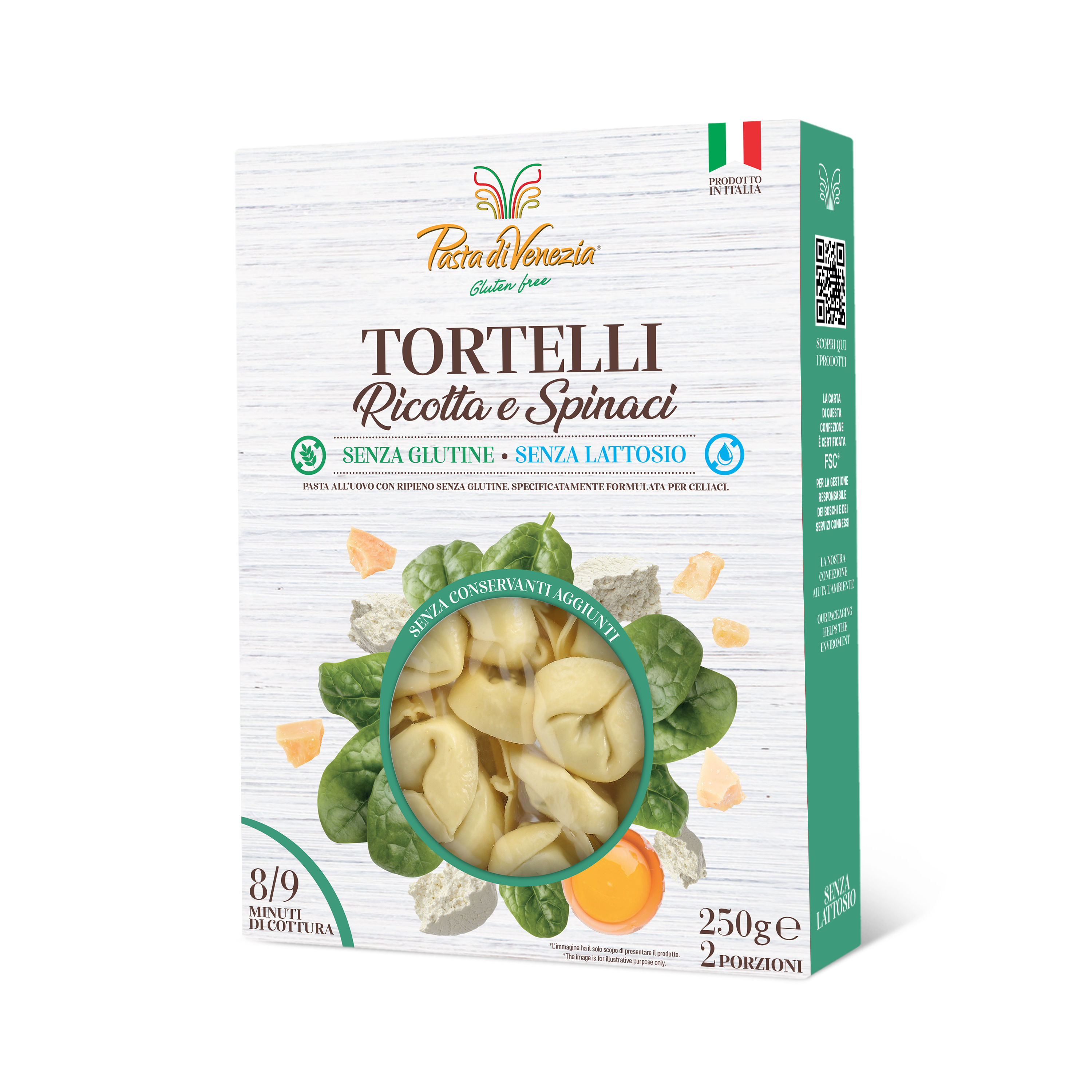 Ripieno 25%: ricotta senza lattosio 13,2%*(siero di latte, latte), formaggio Parmigiano Reggiano DOP 4,4%*(latte, sale, caglio), spinaci in polvere 3,5%*, fibra di bambù, fiocchi di patate, cipolla in polvere, noce moscata.