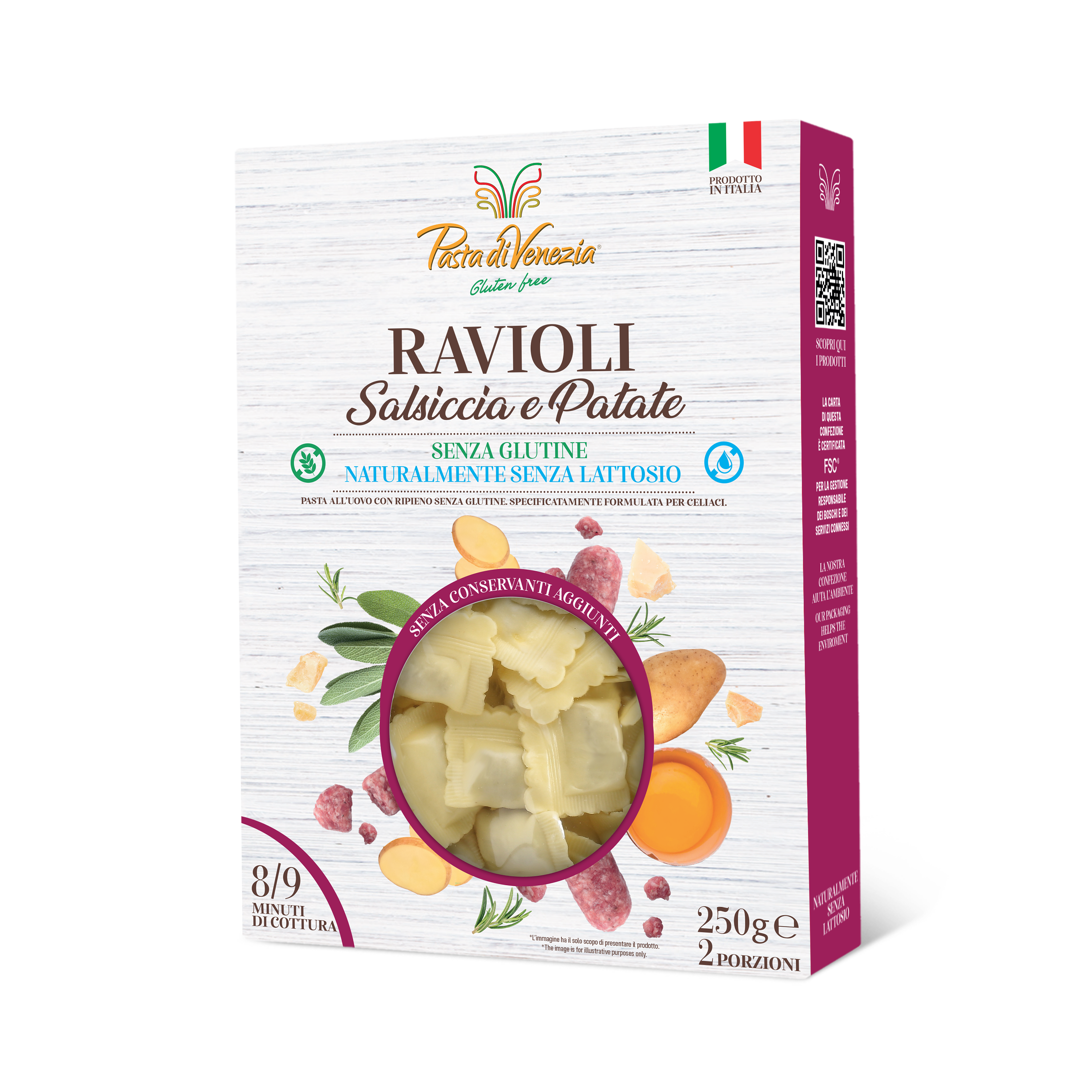 Ripieno 35%: salsiccia 20,1*(carne suina 98%, ariosto (sale marino, rosmarino 1%, aglio, salvia 1%, ginepro, alloro, origano, timo, maggiorana, basilico e piante aromatiche), sale, pepe nero), farina di mais, patate in fiocchi 2,9%*, formaggio Parmigiano Reggiano DOP 1,9%*(latte, sale, caglio), fibra di bambù, aroma naturale, rosmarino 0,2%*.